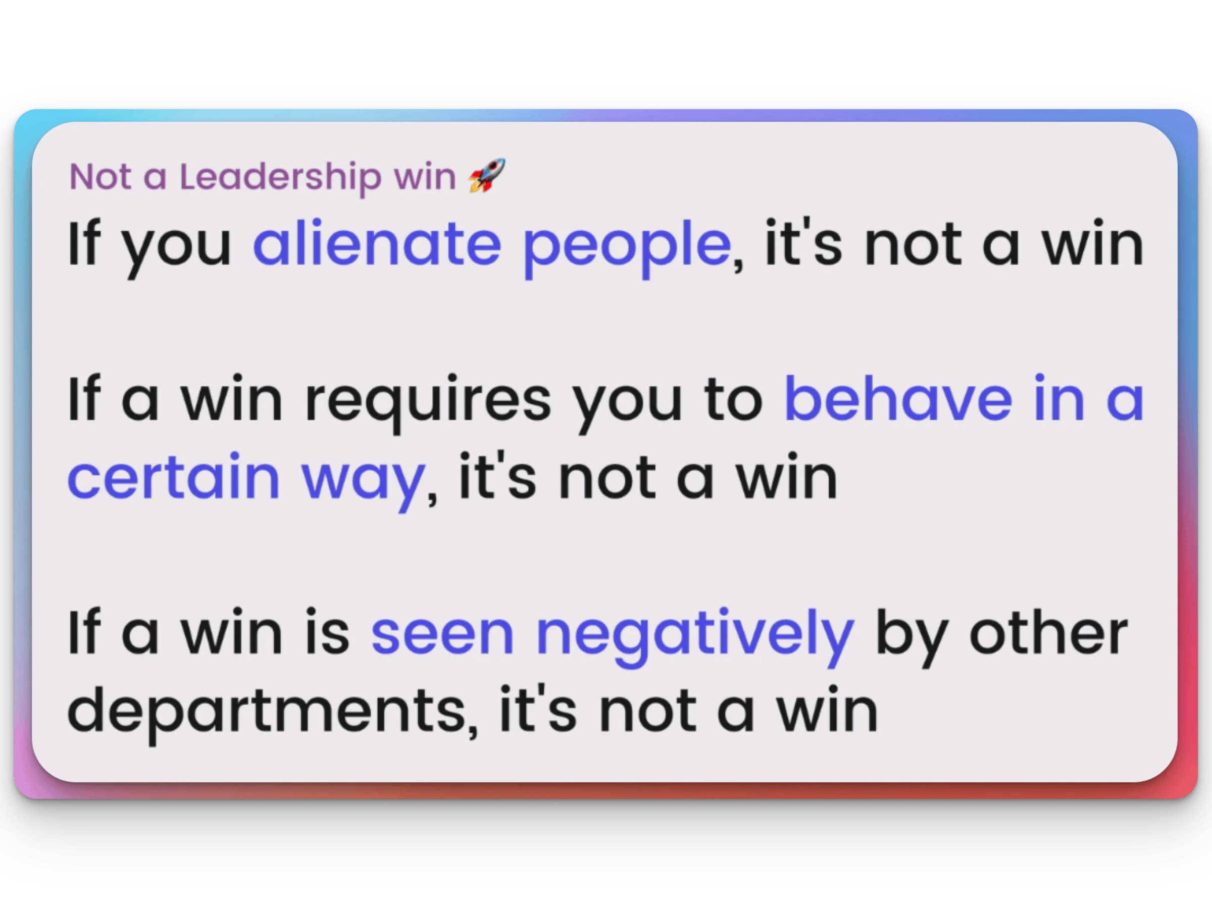 π₯ I liked the concept in regards to leadership wins not necessarily being wins. I think it was a great reminder to focus on what's important. We get laser focused on achieving some goals without realizing they may not actually be wins if we don't keep this in mind